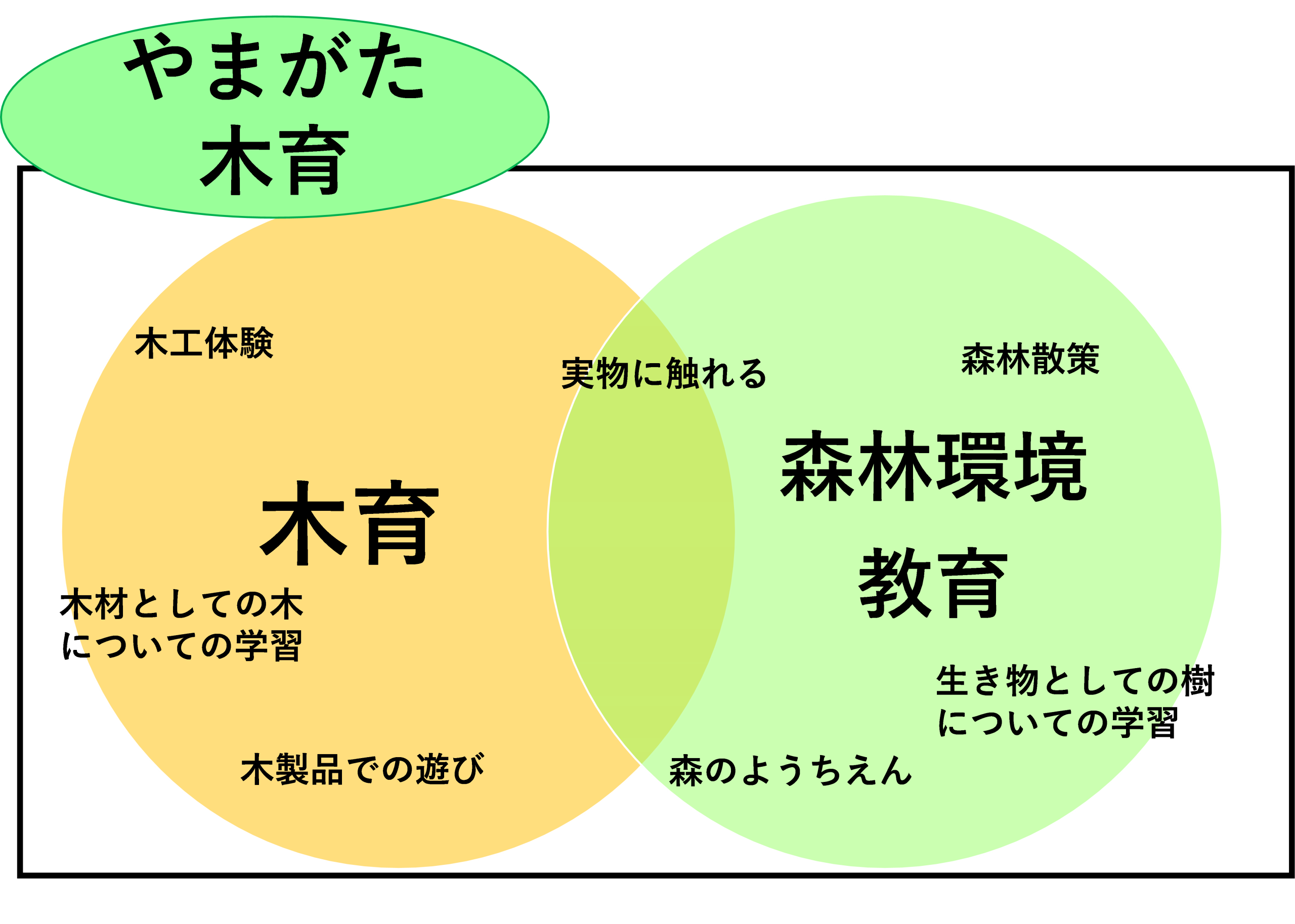 「やまがた木育」は、木づかい運動の一環である「木育」と、森の中で行う森林体験をはじめとする「森林環境教育」を合わせたものと位置づけられています。